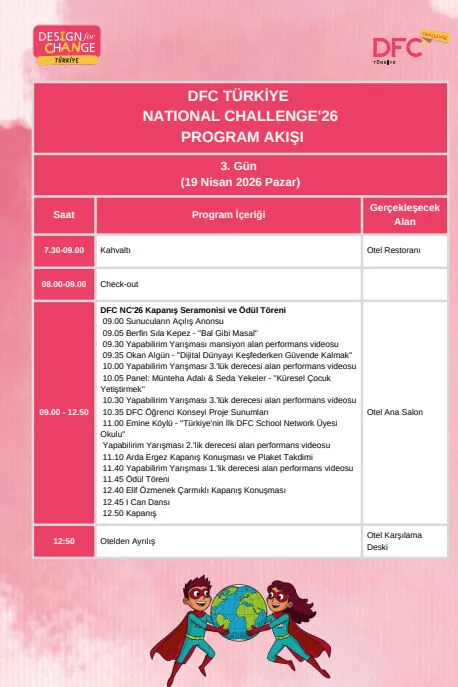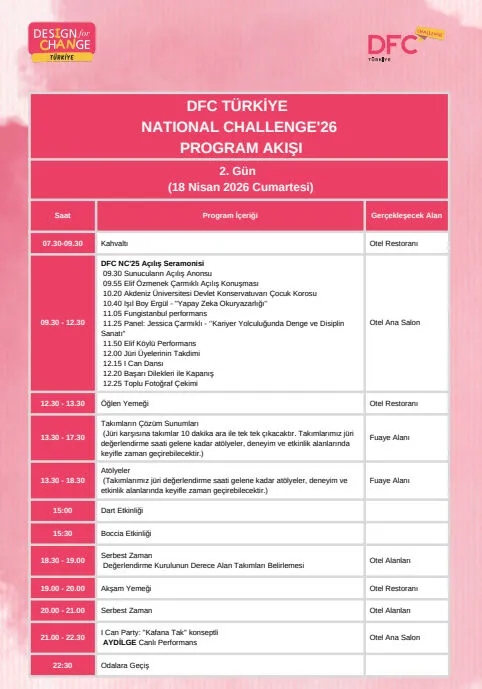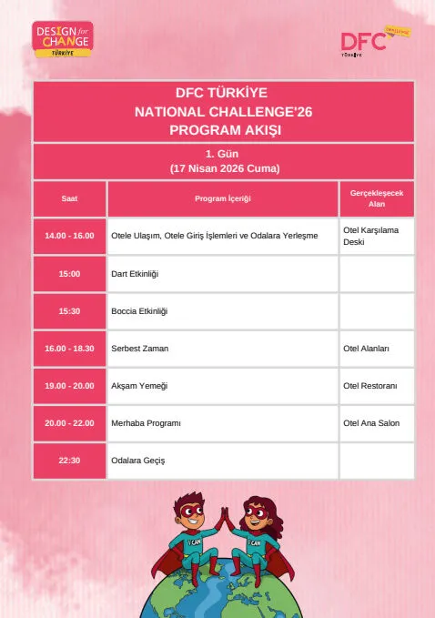 Çocukların ve gençlerin toplumsal sorunlara tasarım odaklı düşünceyle çözüm üretmelerini teşvik eden dünyanın en geniş katılımlı çocuk hareketi Design for Change’in Türkiye temsilcisi DFC Türkiye, yılın en ilham verici etkinliği olan National Challenge’26’ya hazırlanıyor. Öğrencilerin yıl boyu büyük emeklerle hazırladıkları projelerini paylaşacakları buluşmaya günler kaldı.